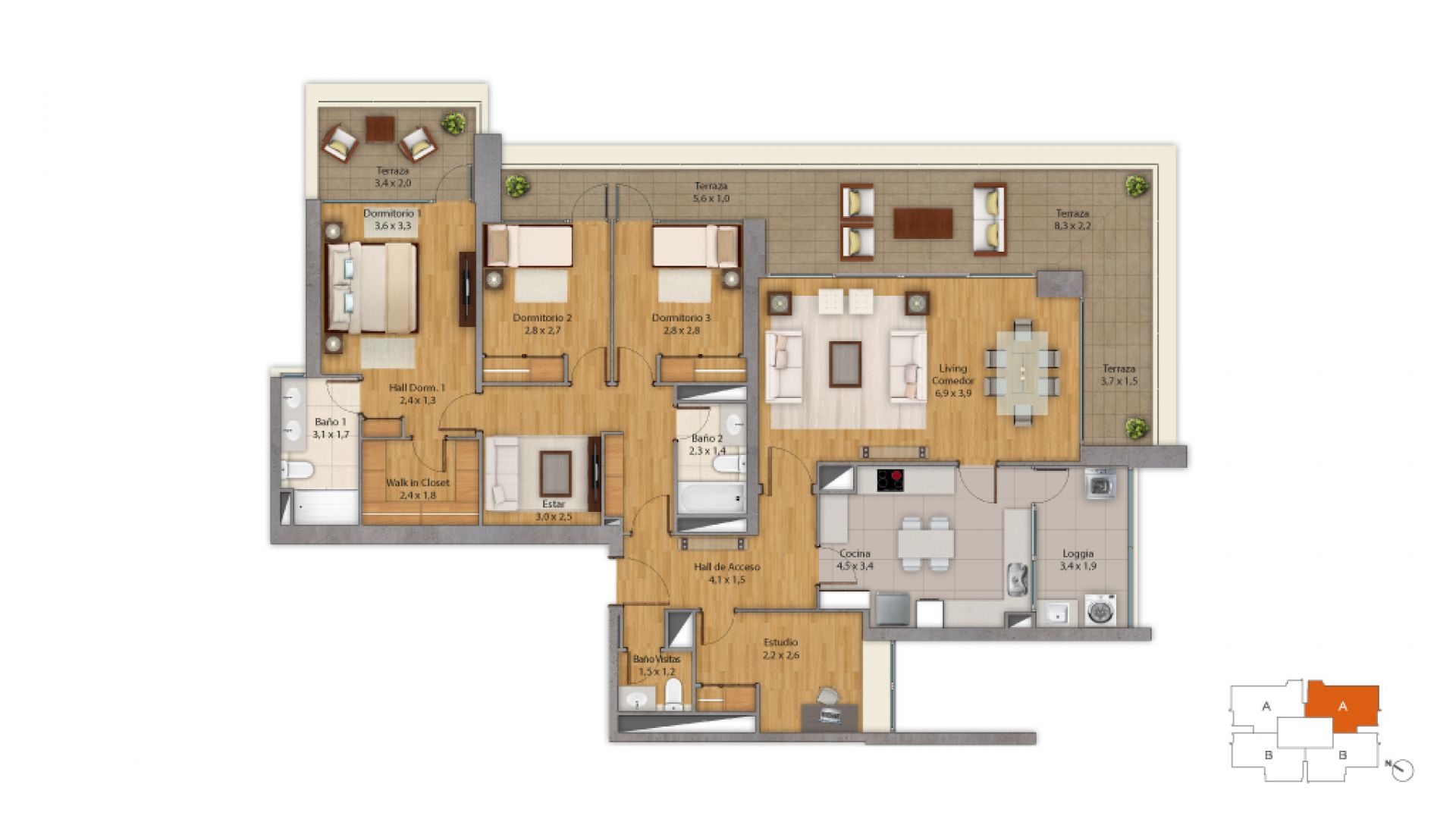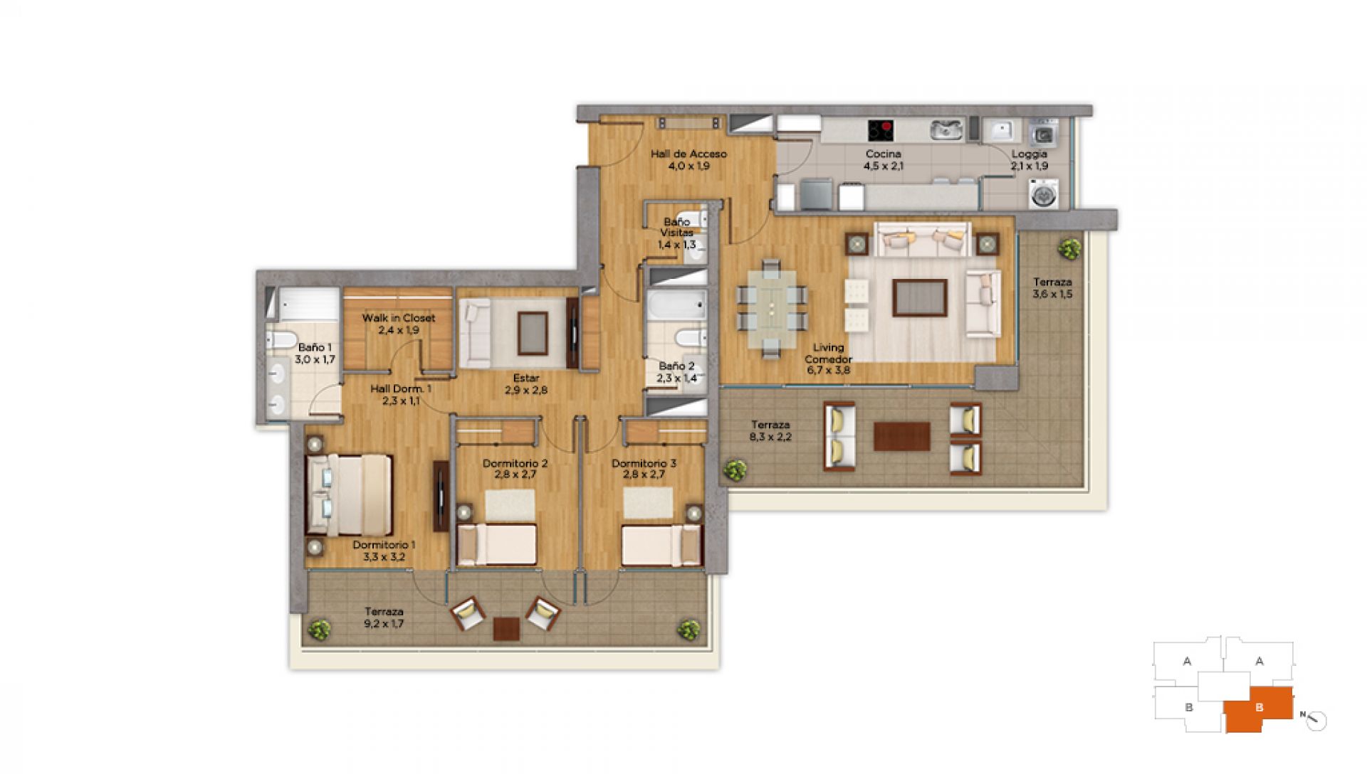 Recorrido 3DInterior: 138,75 m2 Loggia: 8,33 m2 Terrazas (s): 45,62 m2 Total: 192,70 m2 Superficie Útil: 138,75 m2